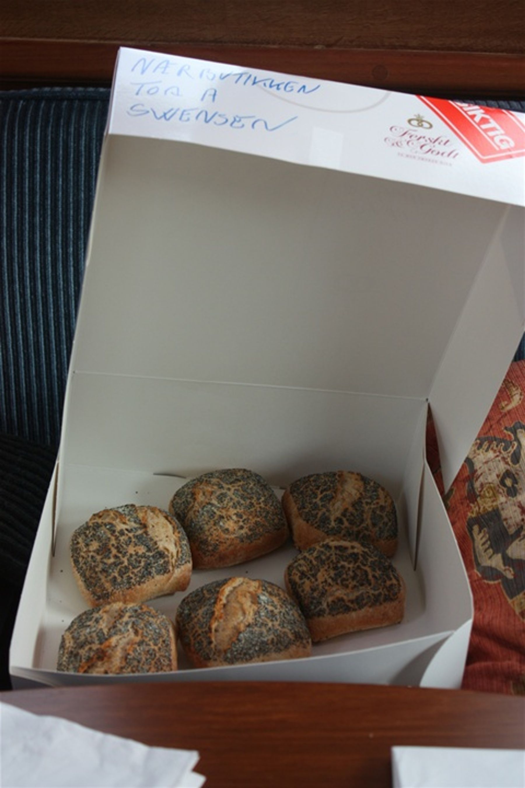 Dagen før hadde vi vært innom landhandelen og var lovet ferskt brød om morgenen. Da vi troppet opp, var beskjeden at det dessverre ikke var brød i dag heller, så derfor hadde den hyggelig butikkdamen stekt rundstykker til oss. Lune, ferdige pakket i stor eske. Stas.