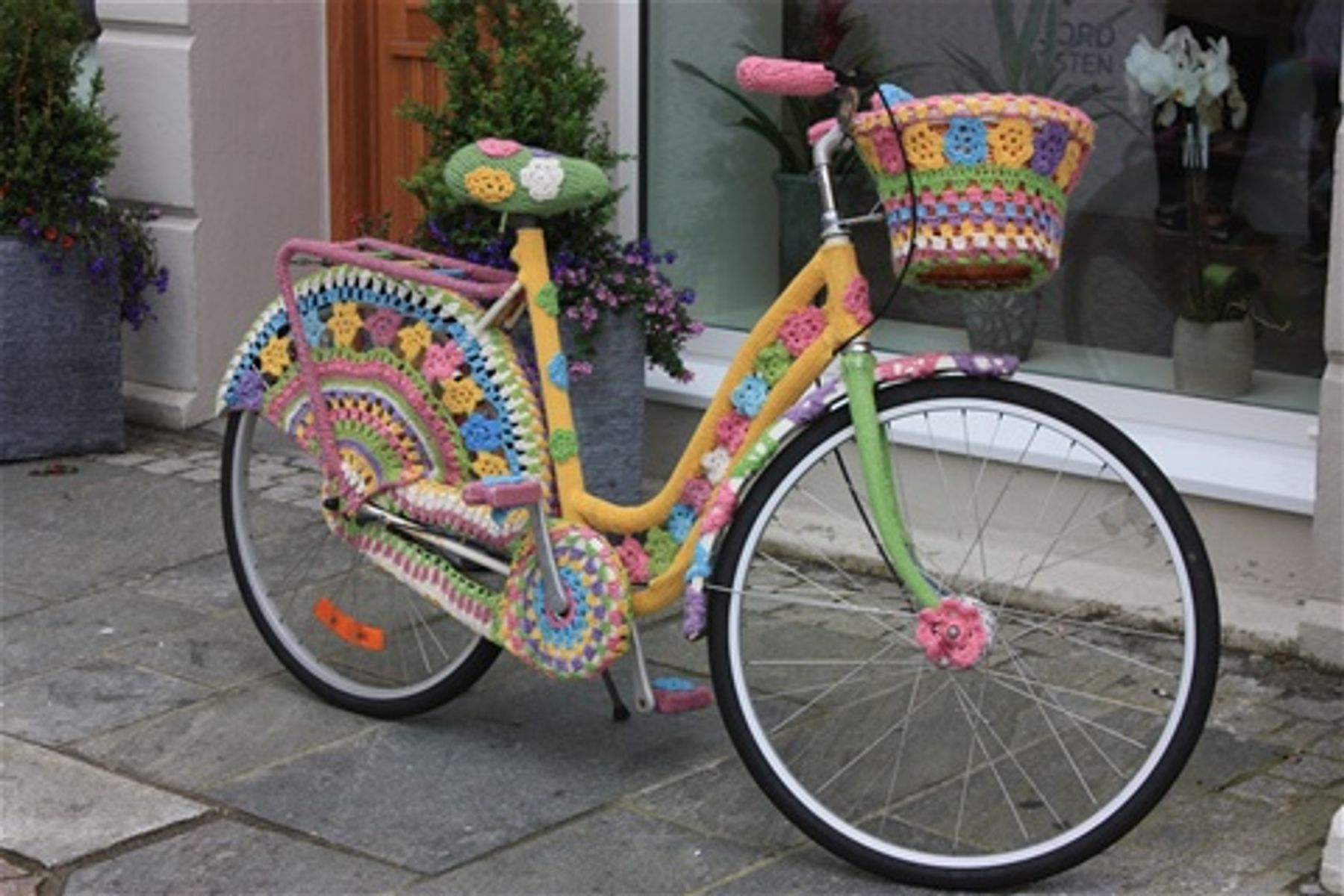 Vi rakk å se Florø mens vi ventet på roligere forhold over Stadt og har bare gode minner fra den byen. En fin havneby og et sjarmerende sted. Det er mange måter å profilere byer på, noen mer kreative enn andre. Florø har gjort det med strikking. Har var hele byen iført strikkeplagg. Benker, stolper, trær, rekkverk, sykler, dører, kledd i fargerike strikkeplagg. Sykkelen på bildet taler vel for seg. Det vi håper Florø gjør noe med er serviceanlegget i gjestehavna. Det holdt ikke mål.