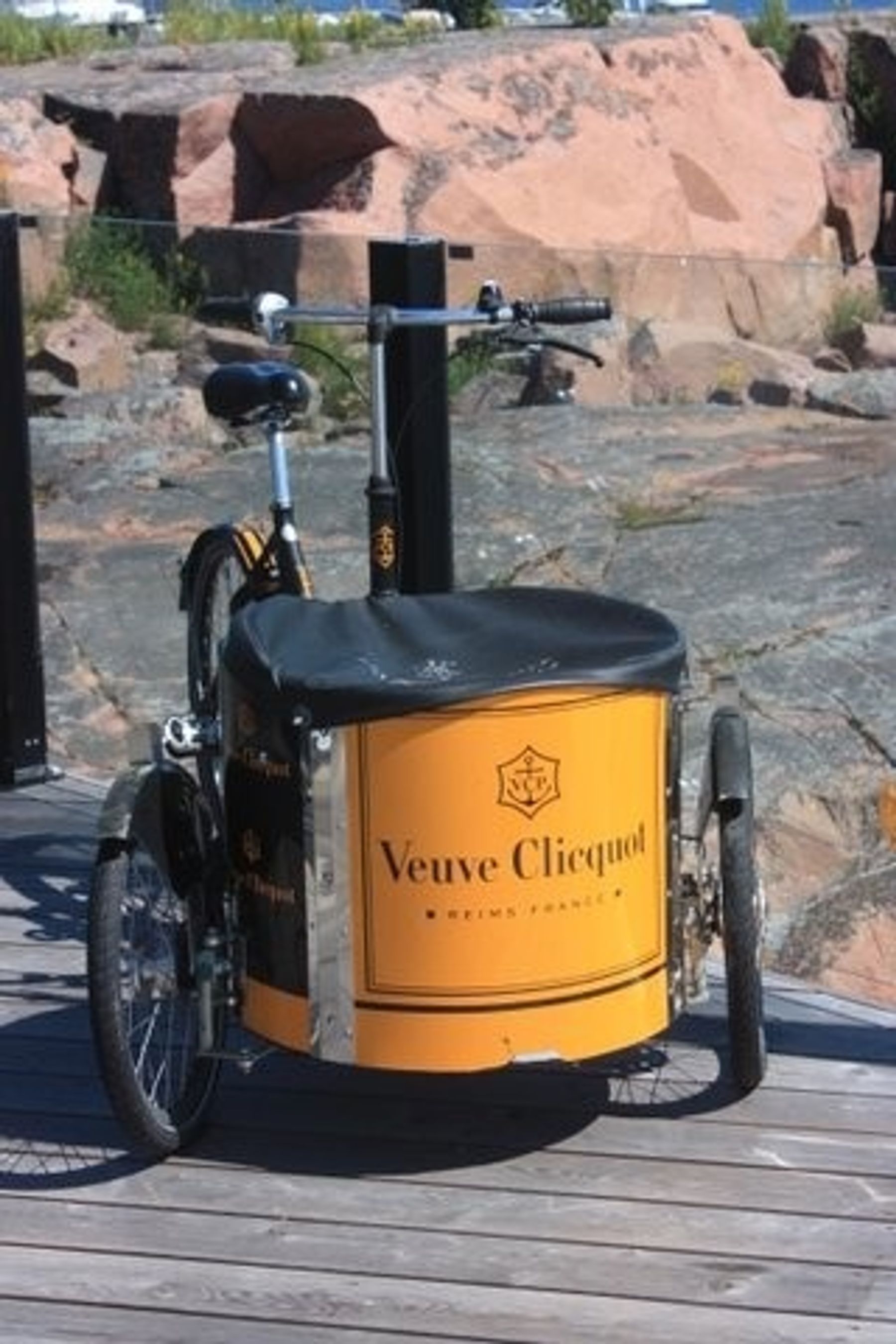 Byer som har slik status har også en standard som står i stil med stedet. Vi ankom Hanko etter noen formiddagstimer underveis og fikk plass som det høver seg for dette stedet. Gjestehavnsprisen var imidlertid ikke avskrekkende, så vi rømmer ikke stedet før etter et par netter. Restauranten her ute på øya hvor vi ligger var nesten verd besøket. Terrasse med utsikt til Finskebukta og stekt sik som smakte utmerket. Det er vel uttrykk for stilen og de mange rike gjestene de mottar her at de har egen sykkel for servering av “gul enke” (bildet). Vi bestilte ikke det.