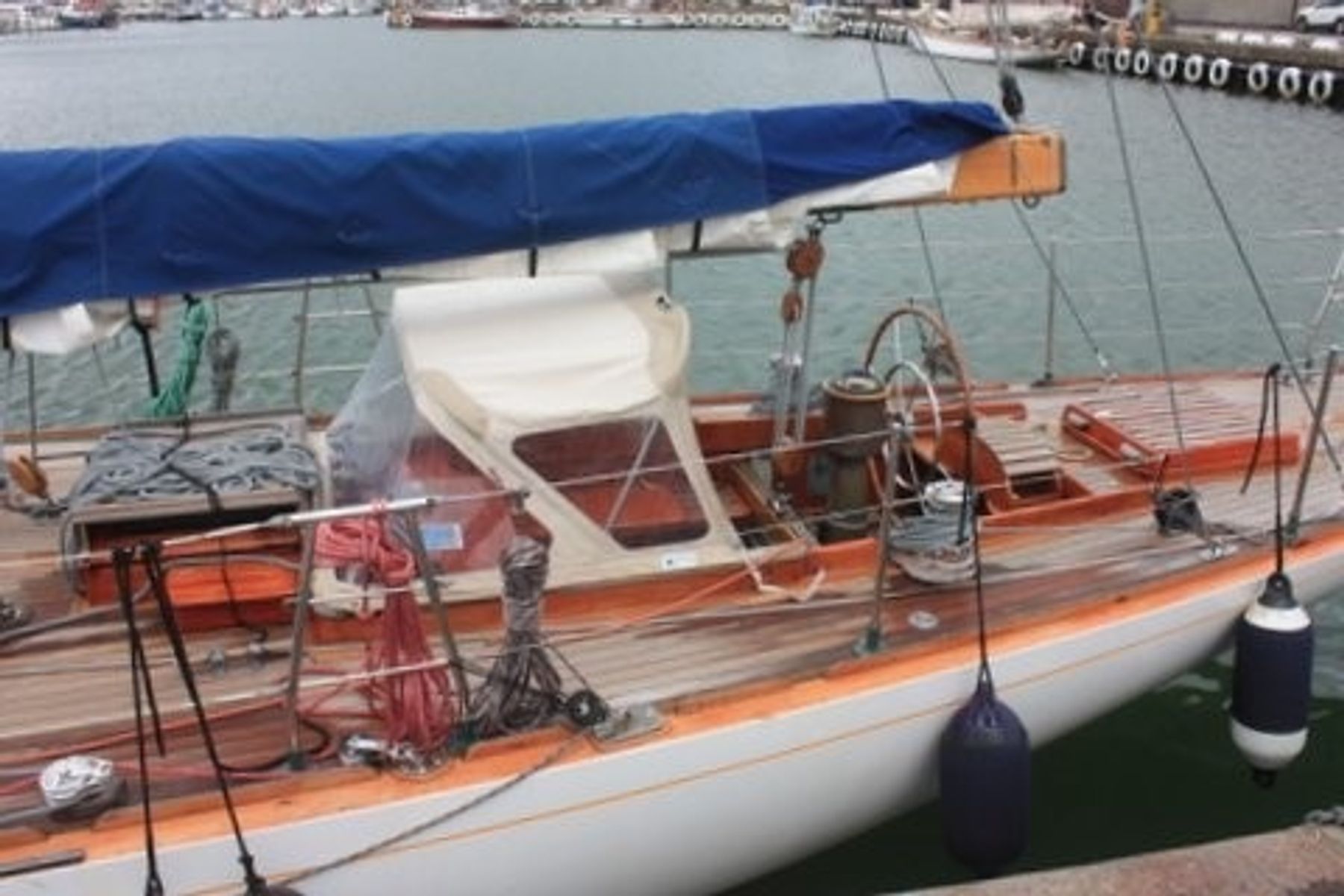 Vi ante allerede ved ankomst at vi kanskje ble her noen dager. Det gode været vi har hatt, særlig siste halvdel av august, er avløst av regn og vestakuling. Regn er ikke farlig, bare vått. Det er annerledes med pålandskuling i Kattegat. Det er krapp sjø og med vestavind får vi skarp kryss. Når vi må, så seiler vi. Nå må vi ingen ting annet enn å komme oss hjem i løpet av september, så da lar vi kulingen hyle og regnet piske mens vi deler havna med noen ganske få, og fortsatt er tyskerne i flertall. Denne gangen kom de i seilbåter som er utenfor de flestes rekkevidde, både økonomisk og praktisk. Men flott er det med et 22 meter langt mahognismykke (bildet).