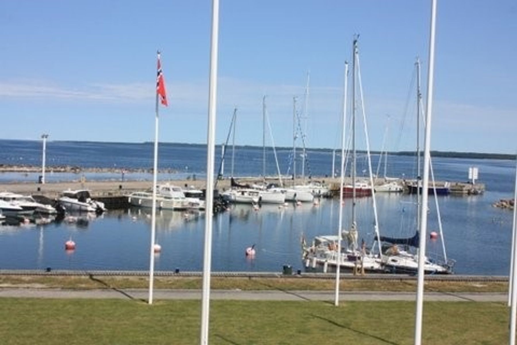 Det som gleder et seilerhjerte i denne havna er at havnekapteinen ikke er en kontorist som bare innkrever havneavgiften, men lenge før båter er inne i havna tar oppstilling på moloen for å gi beskjeder om plassering og er der og hjelper til helt til båtene er fortøyd. Og ikke lenge etter at vi kom, ble det det norske flagget heist i havna (bildet). Det er en hyggelig gest.