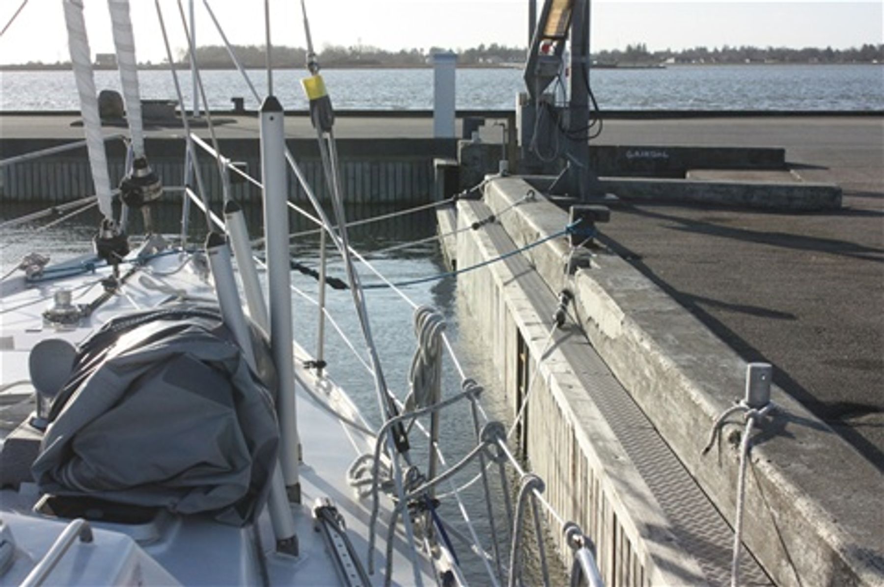 Det er noen dager siden vi oppdaterte bloggen, og grunnen er at vi har ligget i ro her i Hals. Vi holdt oss til planen om å bli til kuldeperioden var over. Den varte noe lenger enn forutsatt, men selv med temperatur helt ned i minus 8, hadde vi fine dager her i havna. Det vi ikke helt hadde forutsett, var at da temperaturen steg fra noen minus og til + 5 over natta, så kom også tåka. Den la seg som et tett lokk over hele Kattegat og reduserte sikten til nesten null. Med dette som utsikt for noen dager, valgte vi å gjøre en liten forandring i planene. Hilde måtte allikevel en tur hjem til Norge nå tidlig på året, så da ble Helge igjen her i tåka for å passe båten, mens Hilde tok seg hjem via Fredrikshavn og Göteborg. Nå er Hilde tilbake, og vi er klare for å komme oss videre, så snart været tillater. Tåka ble avløst av mye vind fra SV. Det var en periode med urolig vær som preget hele Skandinavia. Og her i Kattegat var det opp i 20 sekundmeter, opp til 30 i kastene. Vi sydde oss fast til brygga så godt vi kunne, og vel så det. Men med flatt land, lave moloer og stormflo var det ikke mye som tok av for vinden. Bildet er tatt i dag tidlig, etter at vinden løyet og fortøyningene hadde gjort jobben. Vi hadde et par døgn med ubehagelig mye vind inn forenom tvers. Det blir mye krenging og uro i hele båten. For i morgen tidlig 4. februar melder DMI endelig den vinden vi har ventet på, fra nordvest. Vi klargjør for avreise, setter kursen mot Grenaa.