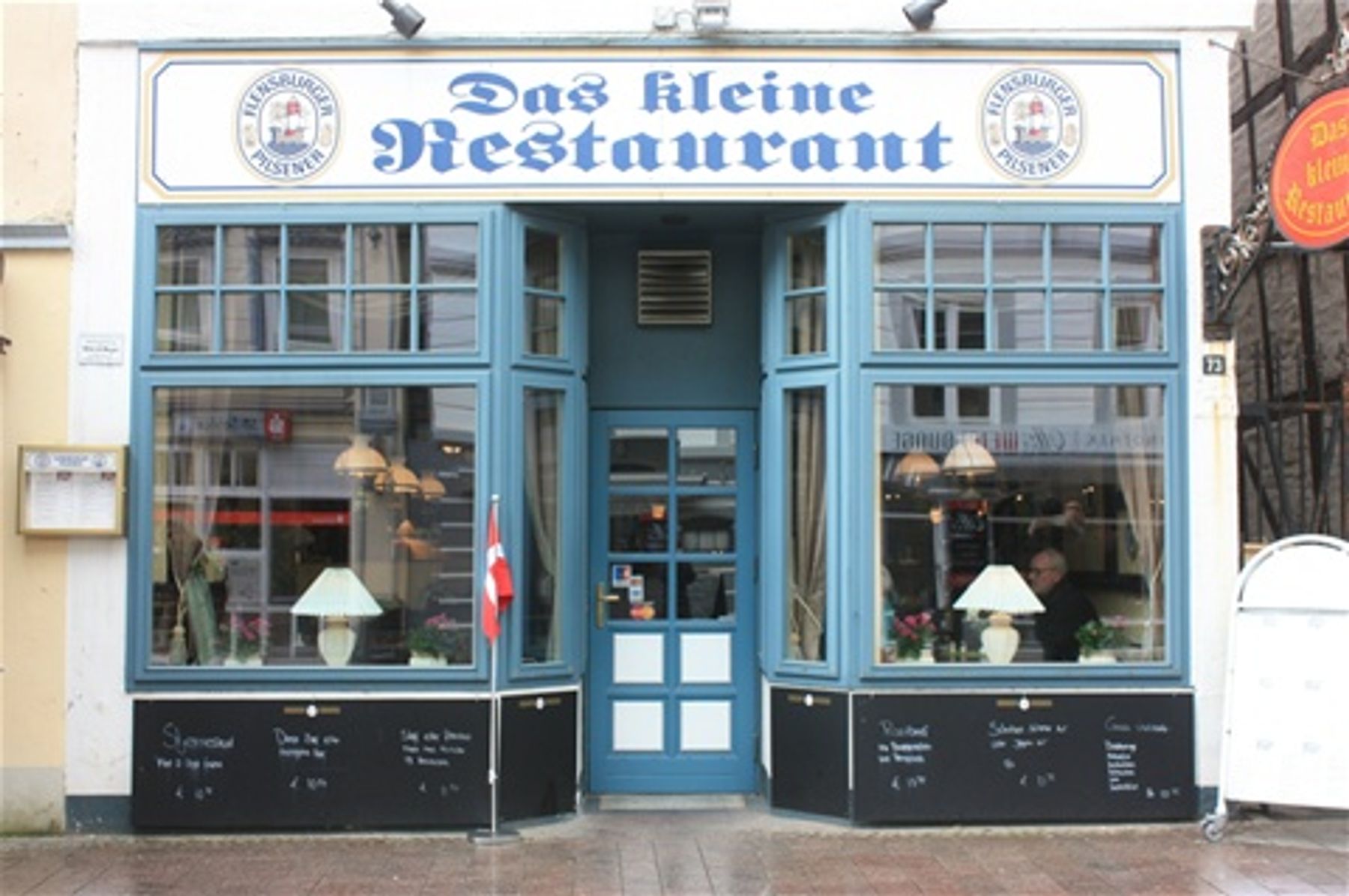 For å ikke bruke for mye tid ut og inn Flensburger Förde med Vilje, tok vi en busstur til den tidligere danske byen Flensborg. Som dere ser av bildet er det viktig å flagge den danske tilhørigheten ved inngangen til restauranten. Og menyen er pære dansk, selvsagt inkludert stjerneskudd.