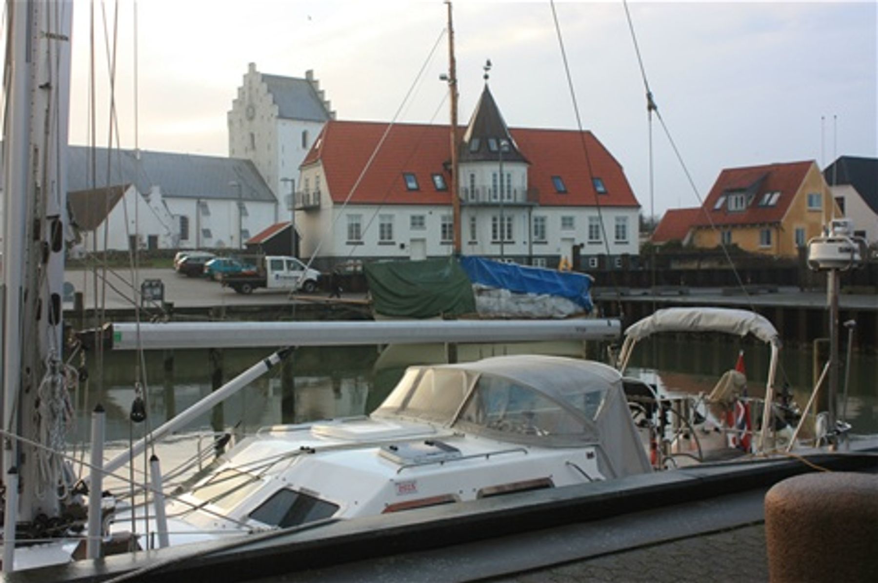 Vi fortøyd for natten og neste varslede kuling mens havna lå blikk stille. Sæby er en fin, gammel by som vi skal skriver mer om, men før det,